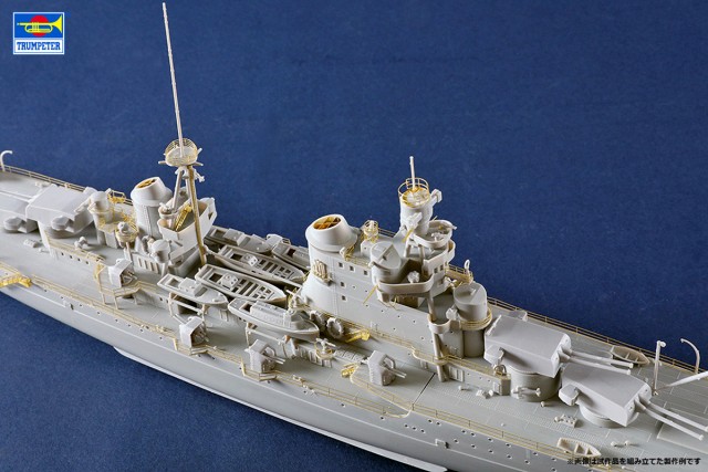 製品はスライド金型で成形された船体(フルハル)や各種上部構造物、主兵装である20.3cm連装砲塔と各高角砲や機関砲を精密なモールドで再現しています。